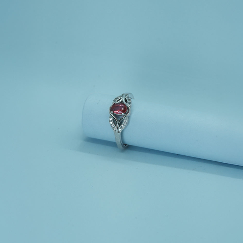 A beautifully crafted silver ring featuring a deep red ruby-like stone set within an intricate leaf-inspired design, adorned with small sparkling stones. A perfect blend of grace and charm.