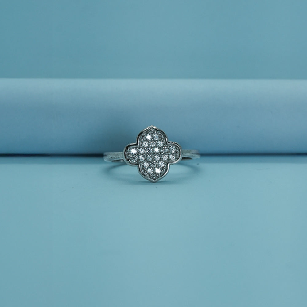 This elegant clover-shaped ring is encrusted with shimmering white stones for a timeless and graceful look. Ideal for both casual charm and evening glamour.