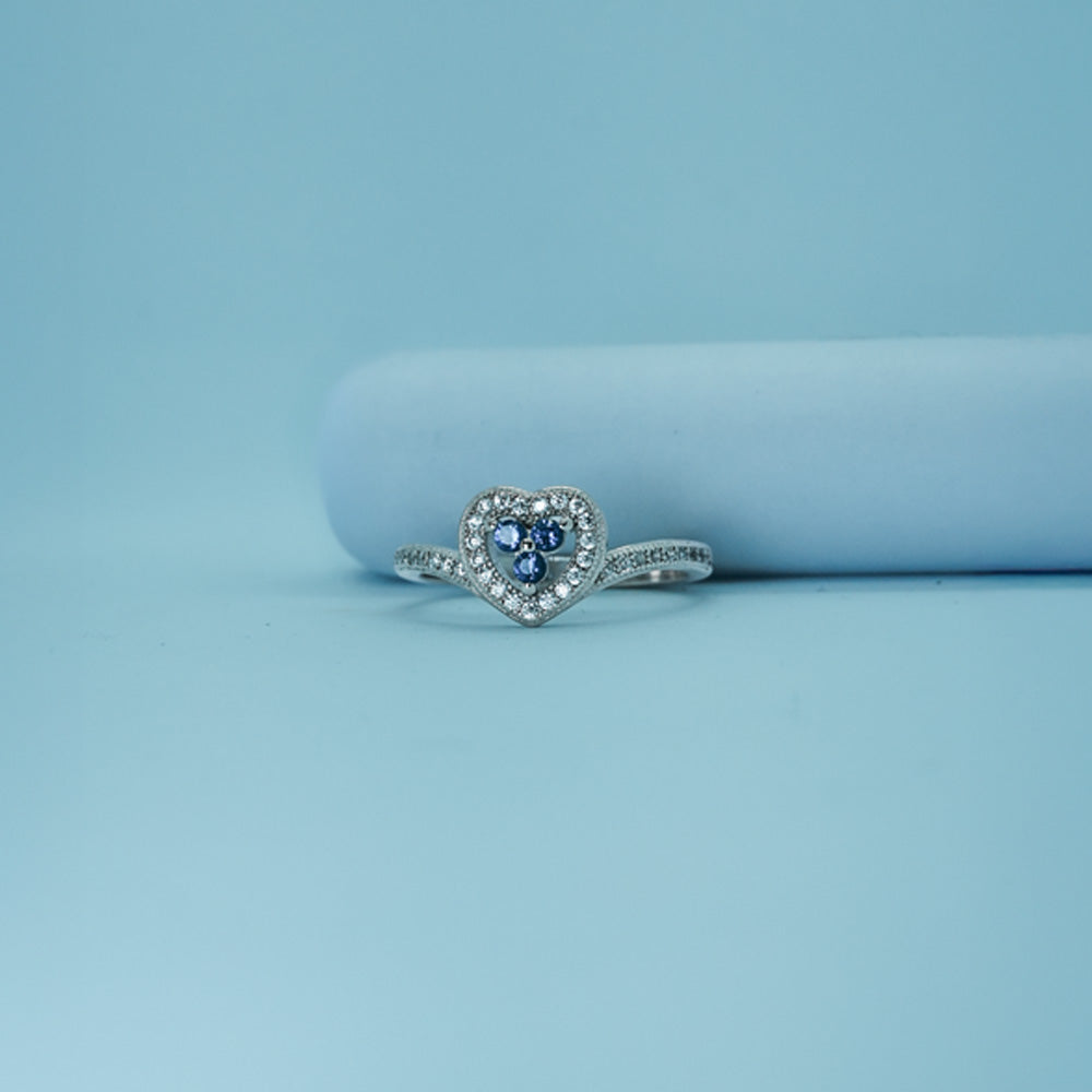 This heart-shaped silver ring showcases a charming blue stone centerpiece surrounded by a halo of dazzling white zircons. A symbol of love with a hint of royal flair — perfect for everyday elegance.