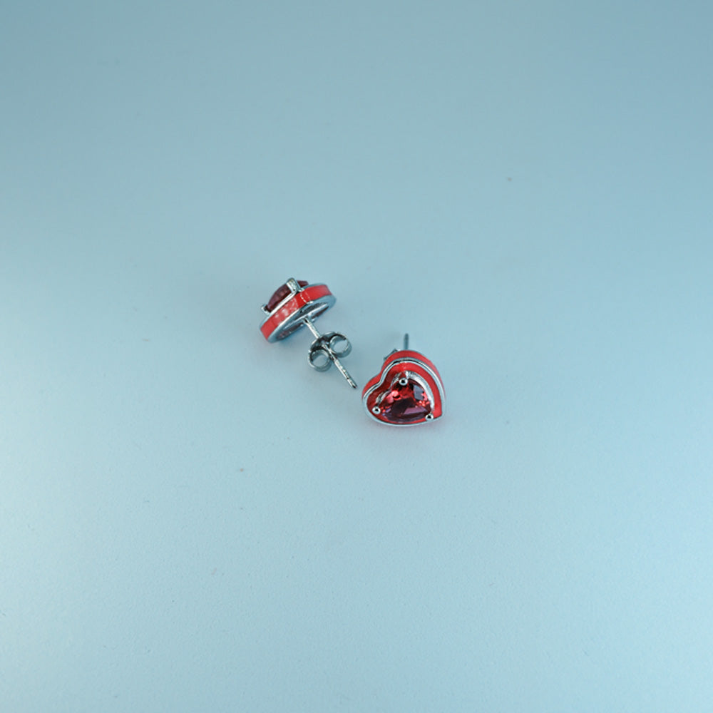 Elegant heart-shaped earrings featuring a vibrant red stone set in a silver-tone frame. Perfect for adding a touch of romance and sparkle to any outfit.