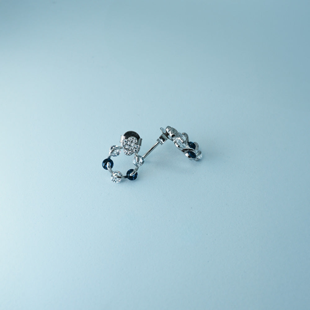 Delicate and dazzling, these loop-style stud earrings feature a mix of sparkling white and deep blue stones. Their unique chain-like design brings a modern twist to classic sparkle — perfect for adding elegance to any outfit.