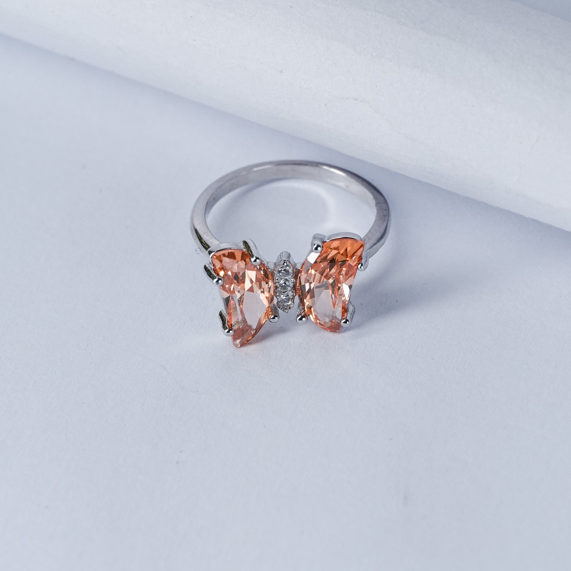 Featuring two stunning peach-hued pear-cut stones with a delicate diamond accent in between, this elegant ring captures the essence of modern charm and timeless beauty. A perfect choice for those who love subtle color and sparkle.