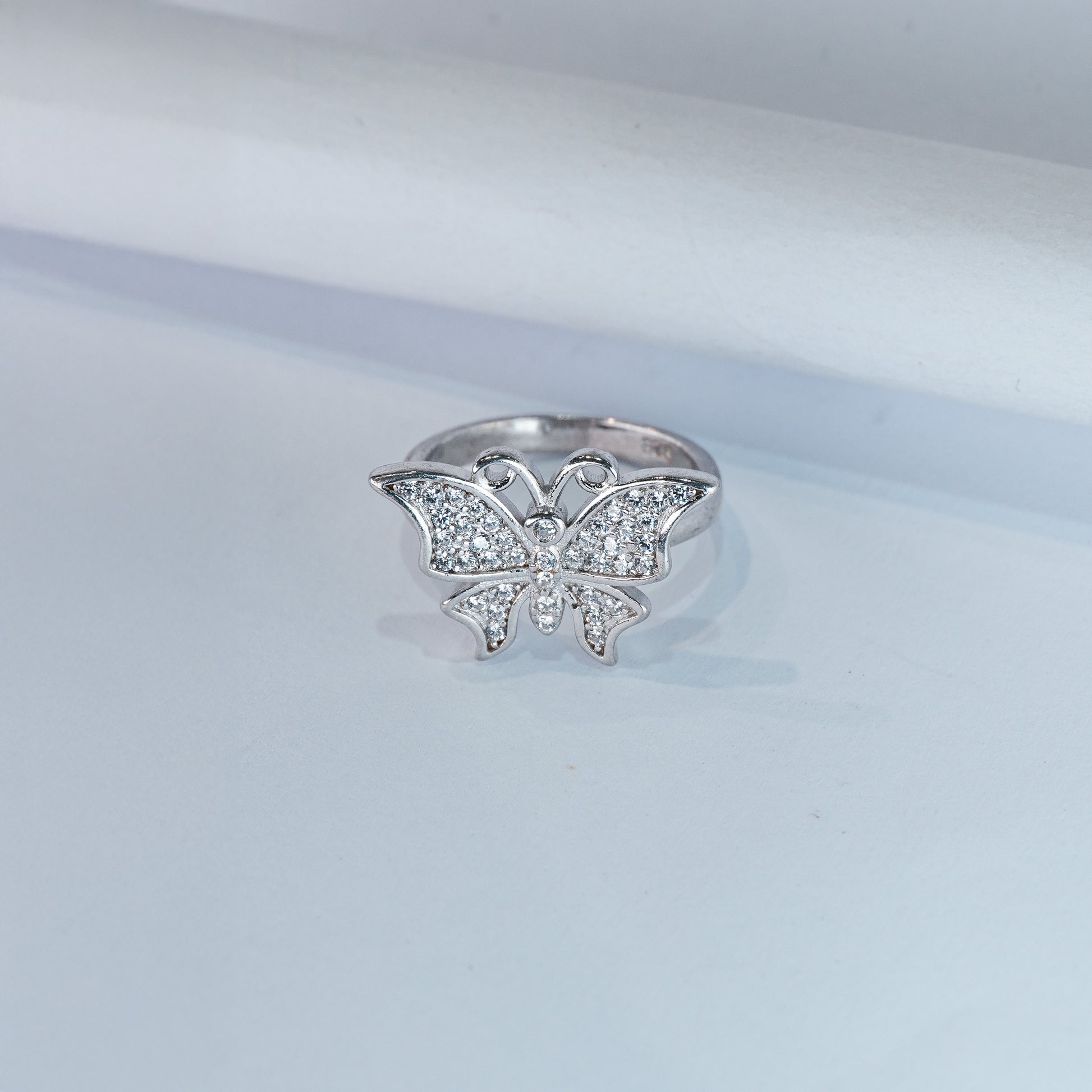 Add a touch of nature-inspired elegance with this beautiful butterfly ring, adorned with shimmering stones. A whimsical and graceful accessory that captures the beauty of transformation and freedom.