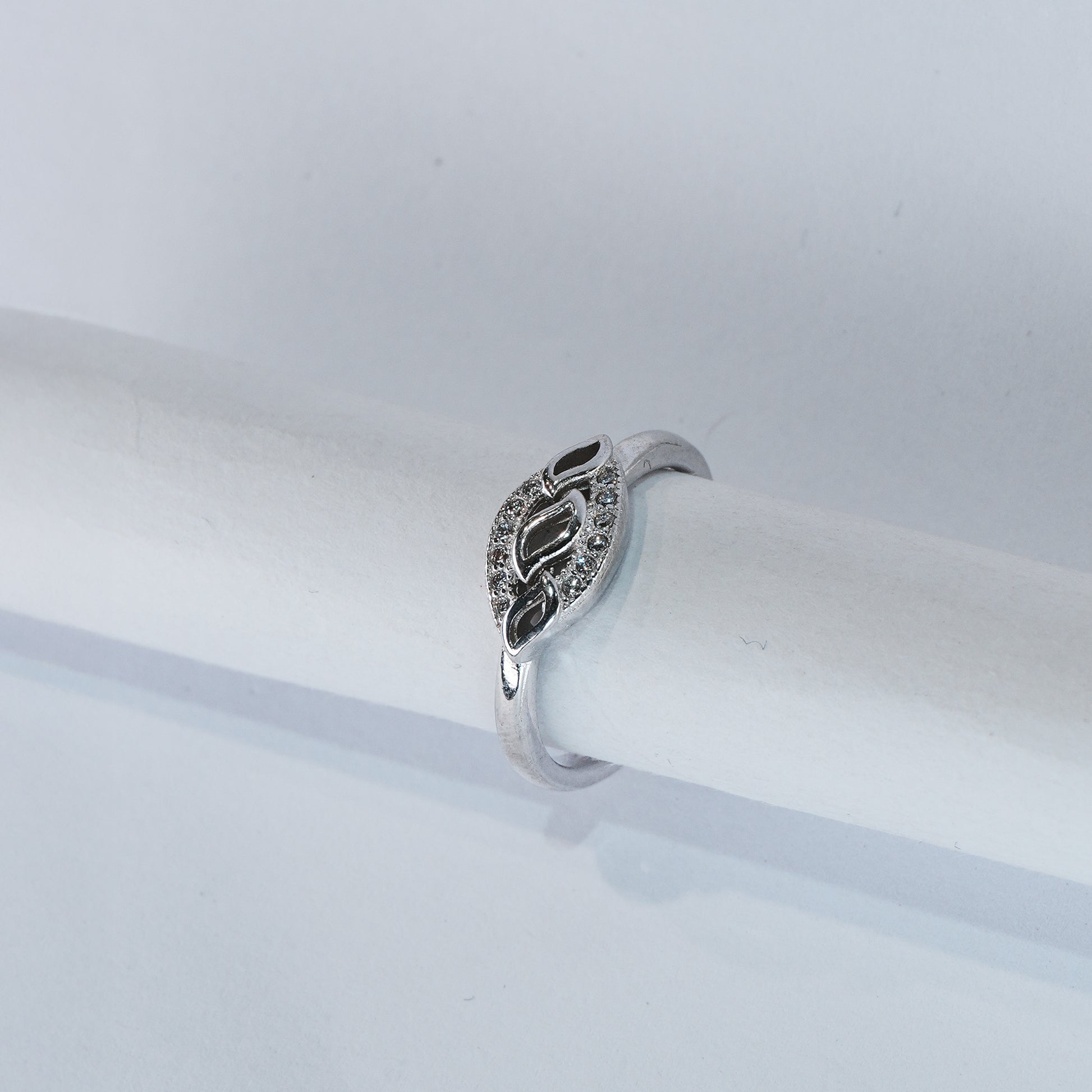 This delicate ring features a graceful leaf-inspired design accented with sleek black stones and a halo of sparkle. A subtle yet stylish piece perfect for modern minimalism.