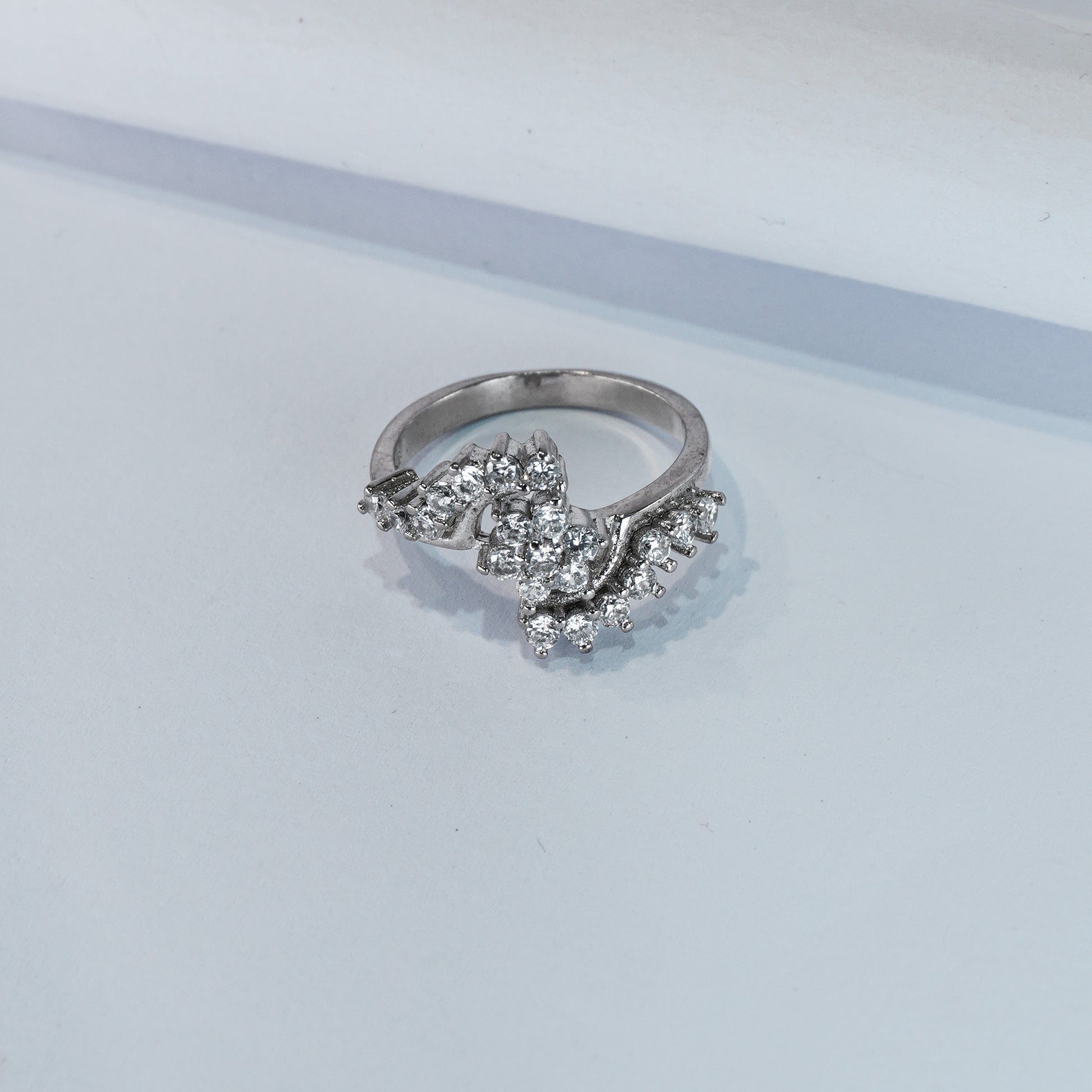 A graceful sterling silver ring with an intricate twisted design, adorned with shimmering cubic zirconia clusters that create a luxurious, eye-catching sparkle.
