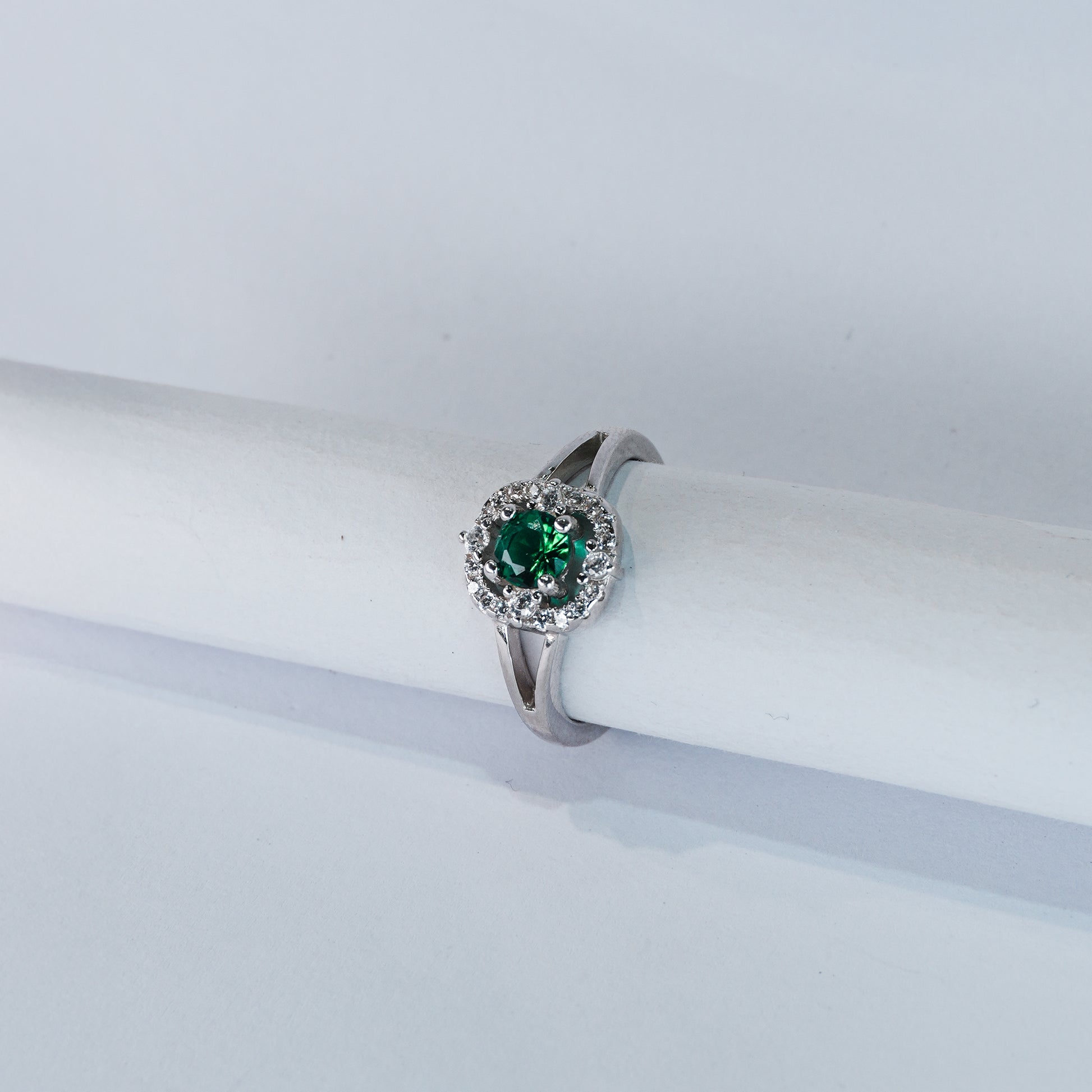 A stunning 92.5 sterling silver ring featuring a vibrant green emerald at the center, beautifully encircled by sparkling cubic zirconia stones for an elegant halo effect.