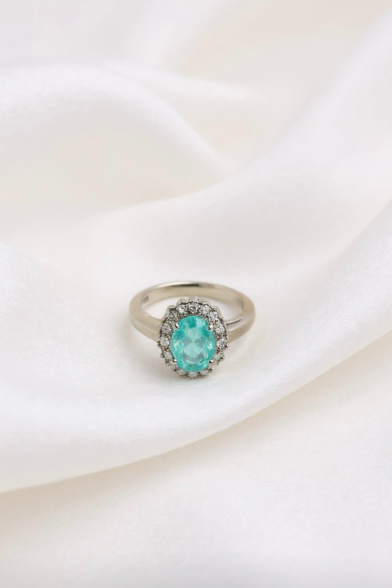 A captivating aqua gemstone set in a radiant halo of shimmering crystals. Fresh, vibrant, and ideal for adding a luxurious pop of color to any look.