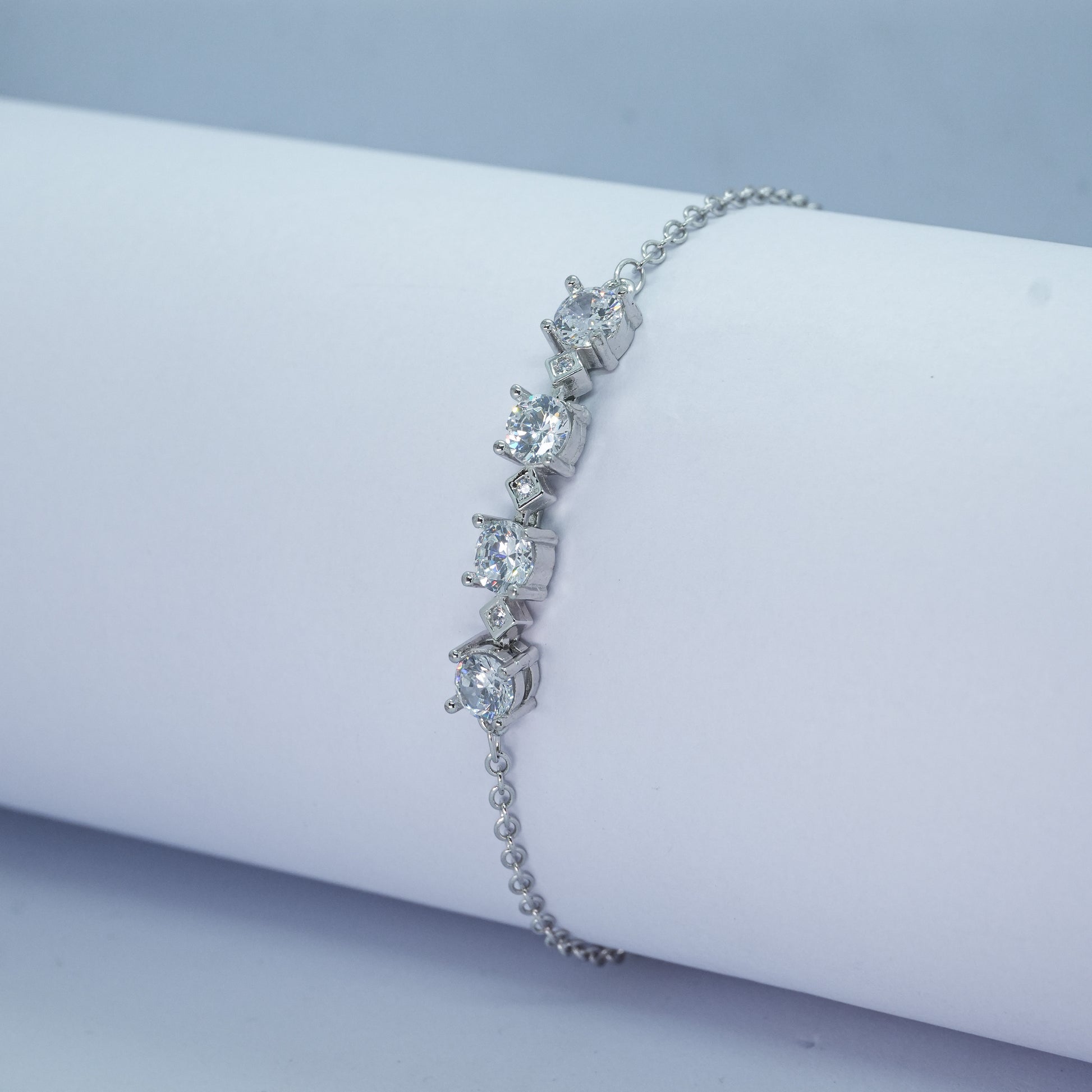 Elegant silver bracelet with five sparkling cubic zirconia stones in a prong setting, radiating timeless beauty and brilliance.
