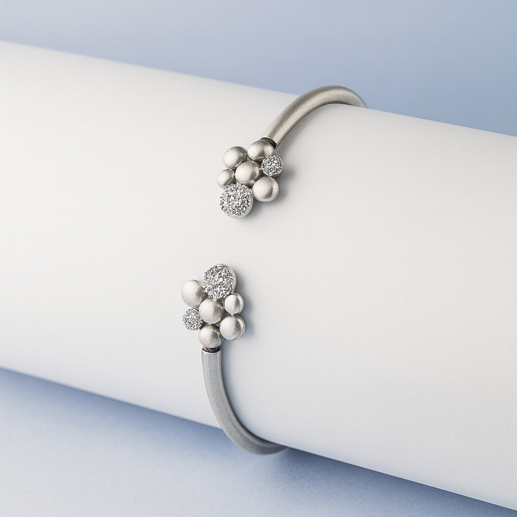 This chic 925 silver bangle showcases a unique cluster of pearls and diamonds, creating a modern yet elegant look. The fine detailing and high-quality craftsmanship make it the perfect piece to add a refined, luxurious touch to any outfit.