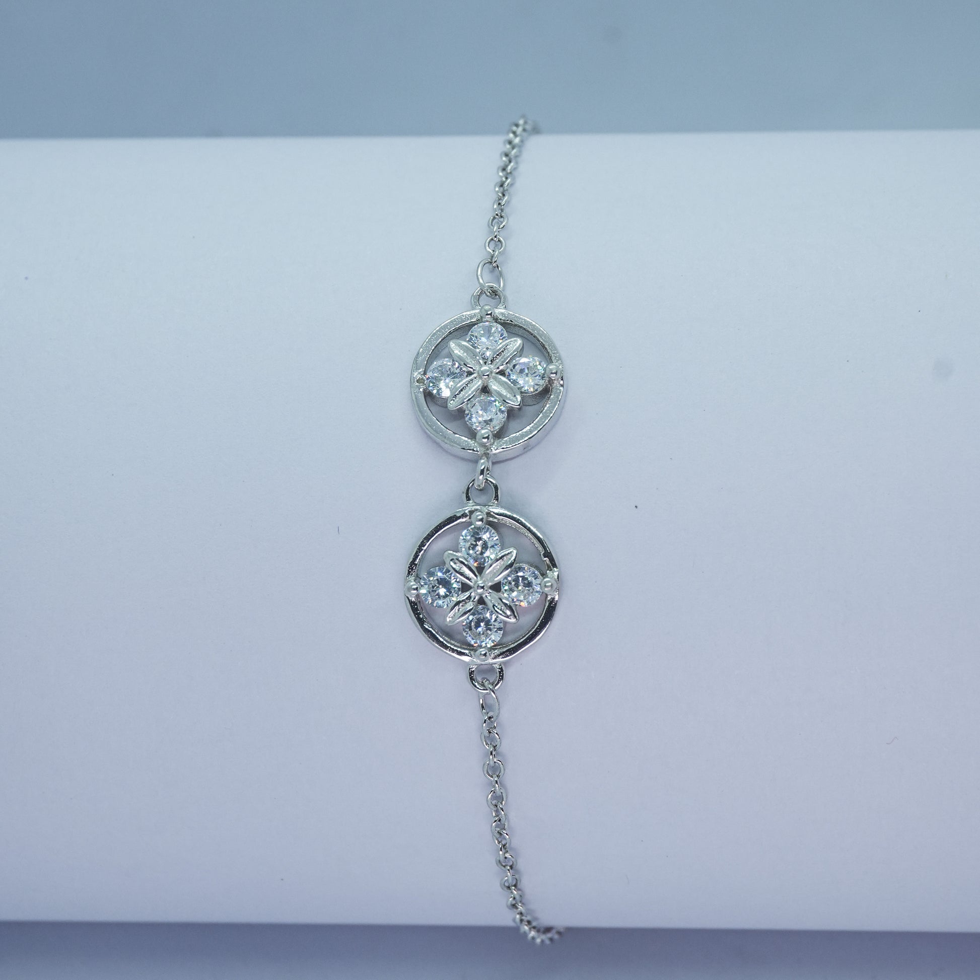 Sleek silver bracelet adorned with round-cut cubic zirconia stones in a modern bezel setting for everyday sparkle.