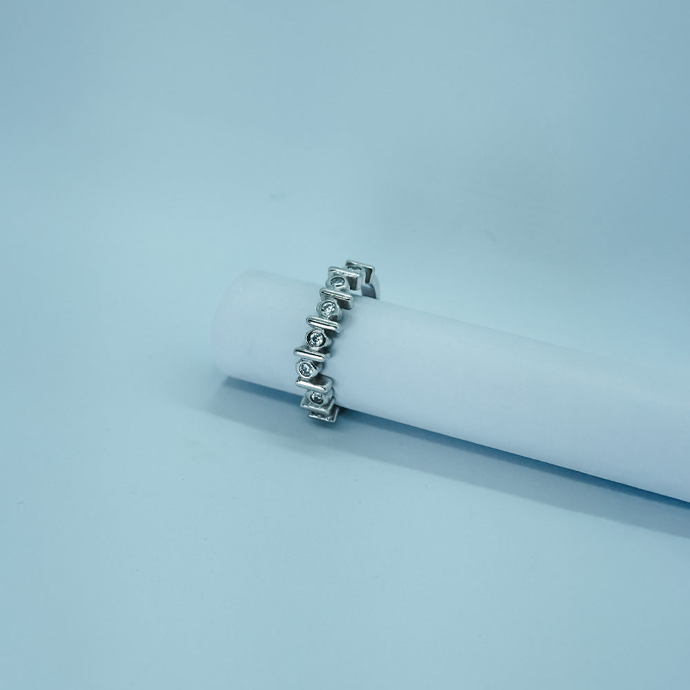 Sleek silver band shaped like a tiny tiara, fully studded with white stones. Minimalist royalty for everyday wear.