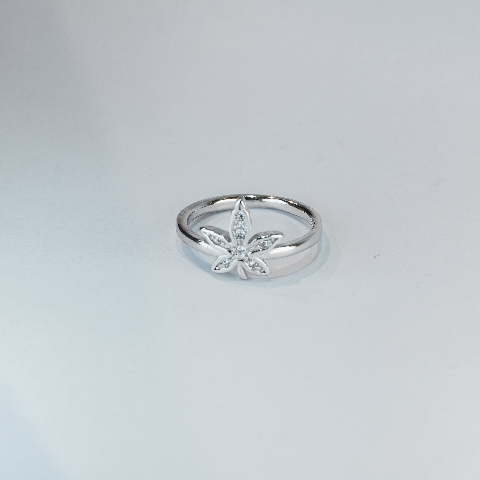 A nature-inspired silver ring designed with a sparkling crystal-studded leaf motif. A fresh and unique accessory for nature lovers and style seekers alike.