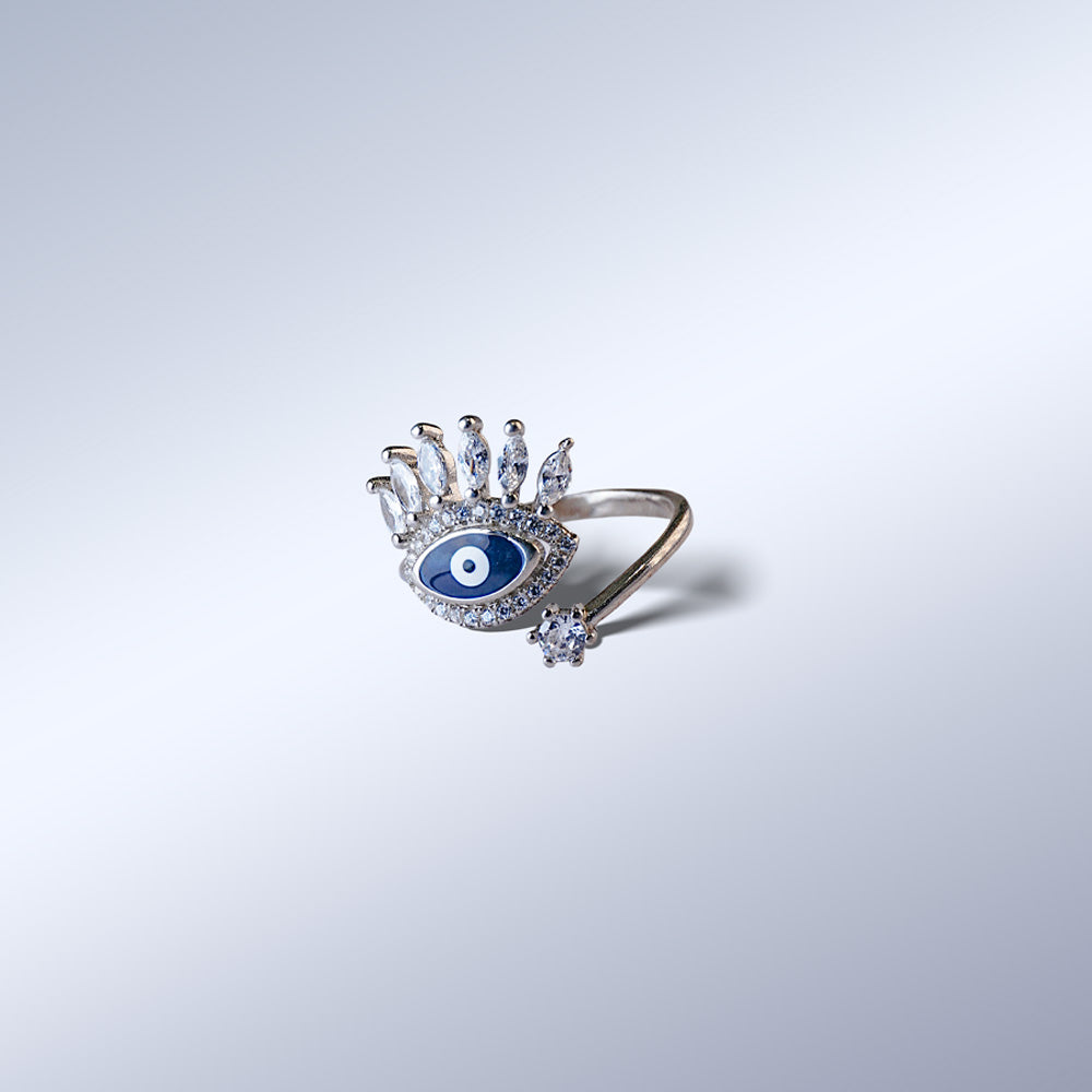 Symbolizing protection and power, this ring features a central evil eye motif under a crown-like crystal arc. Crafted in sterling silver with fine detailing.