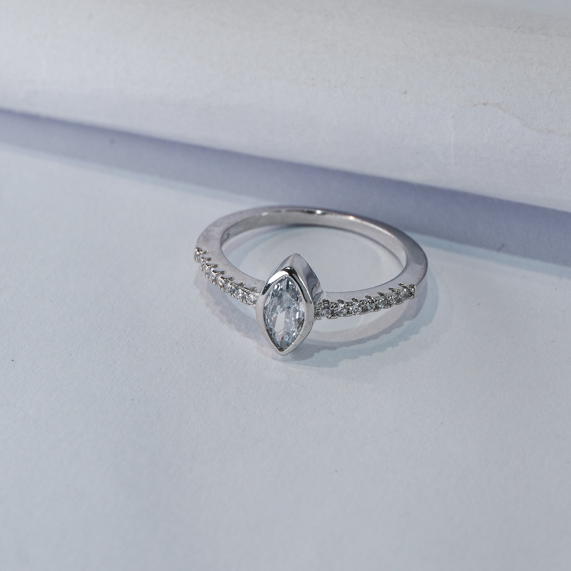 Refined and timeless — this silver ring showcases a marquise-cut clear stone at the center, complemented by a band of delicate white crystals. Ideal for engagements or elegant occasions.