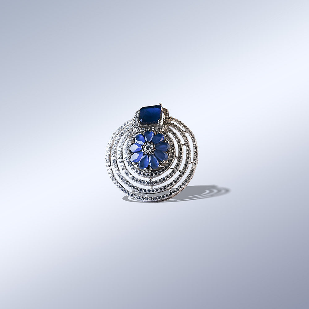 Bold and unique, this floral-inspired ring features deep blue stones and concentric diamond circles.