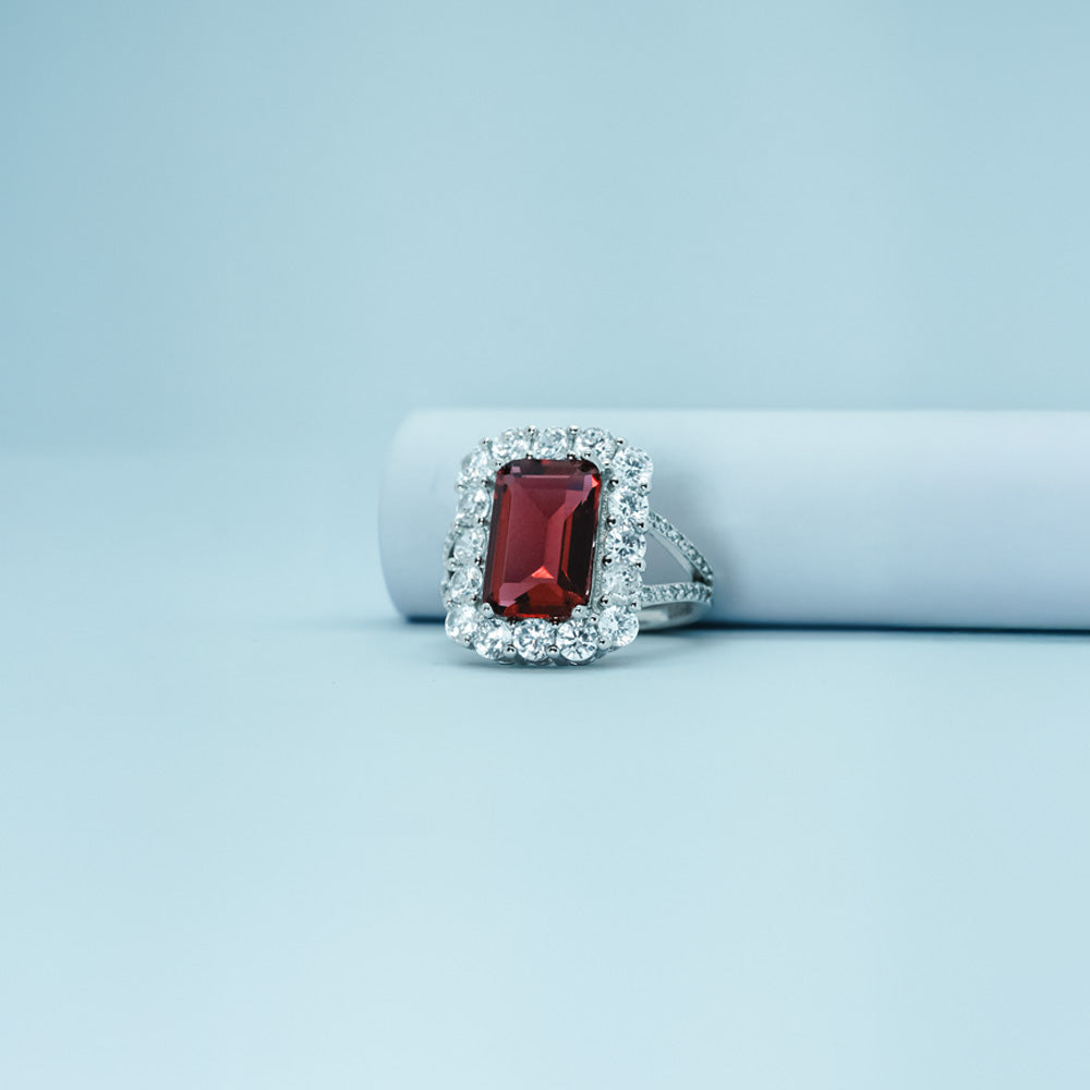 Abstract silver design wraps around a central solitaire stone. Artistic and contemporary, made in fine sterling silver.