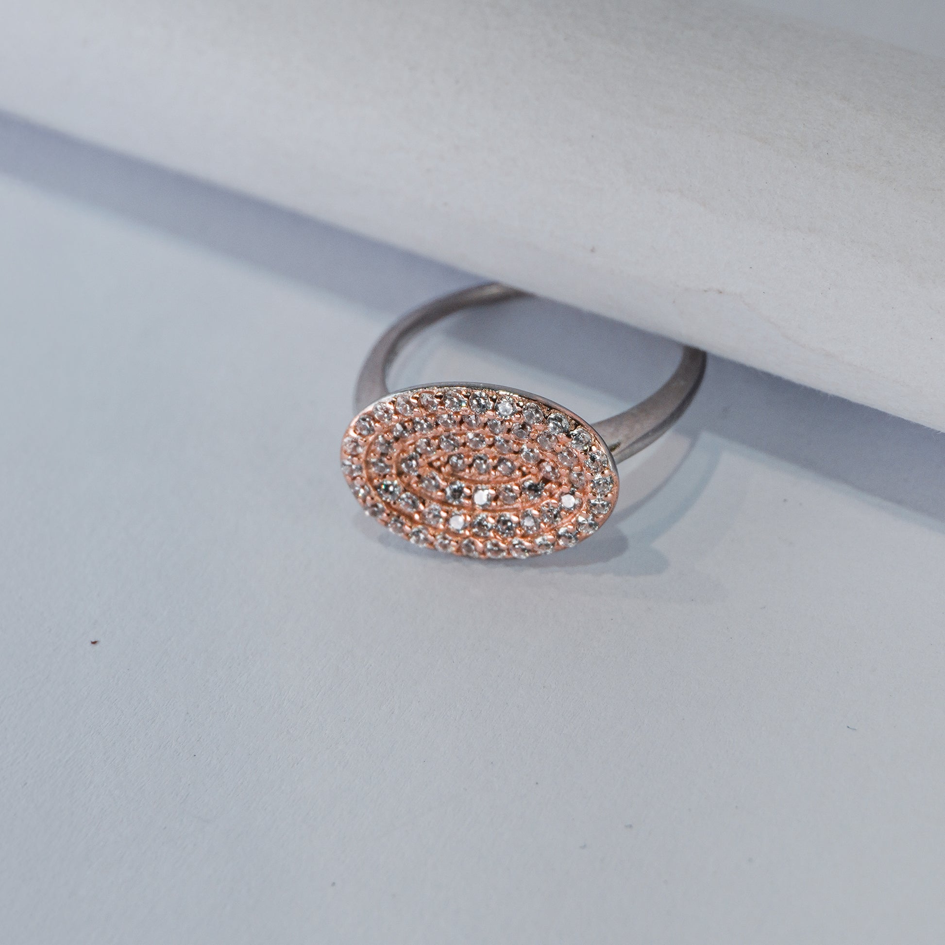 Elegant rose gold-toned oval ring encrusted with multiple rows of shimmering stones. A statement piece that adds glam to any outfit.