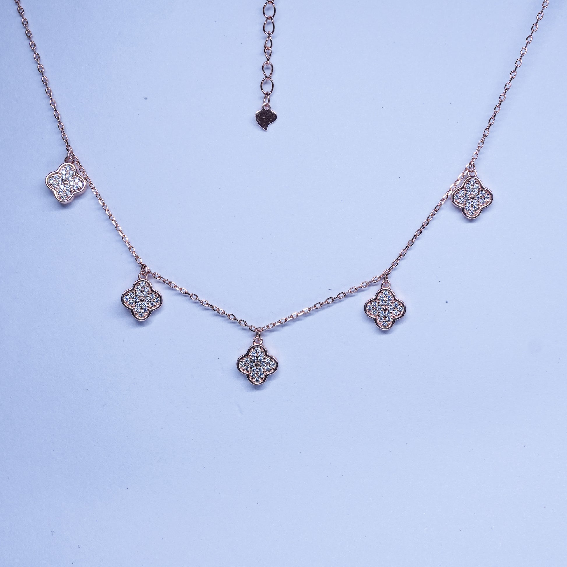 Elegant rose gold plated necklace with sparkling clover-shaped drops crafted in 925 silver, ideal for adding a graceful touch to any outfit.
