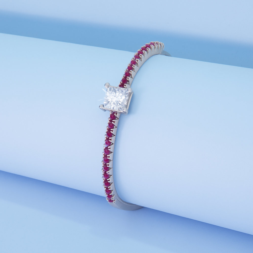 Elevate your elegance with this 925 sterling silver bangle featuring a dazzling princess-cut center stone and a sleek line of ruby-colored stones. Perfect for both daily wear and special occasions.