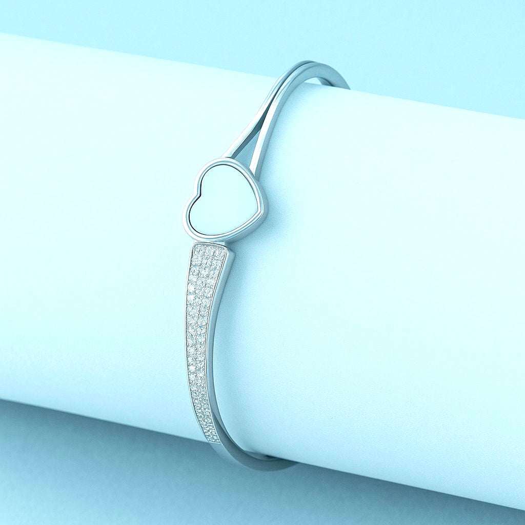 Celebrate love and simplicity with this delicate 925 silver bangle featuring a sleek heart charm and a band adorned with fine cubic zirconia stones. Ideal for gifting or everyday elegance.