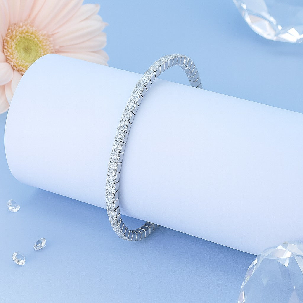This timeless 925 silver bangle features a continuous line of sparkling diamonds, offering an elegant and refined look. Perfect for both everyday wear and special occasions, its classic design ensures it complements any style with grace and sophistication.