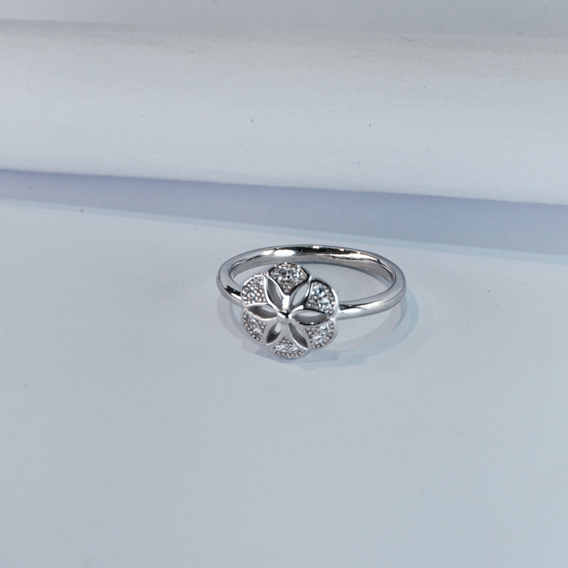 A sleek silver ring with a dazzling floral design, accented with sparkling white stones. A perfect blend of minimalism and charm, ideal for both casual and formal occasions.
