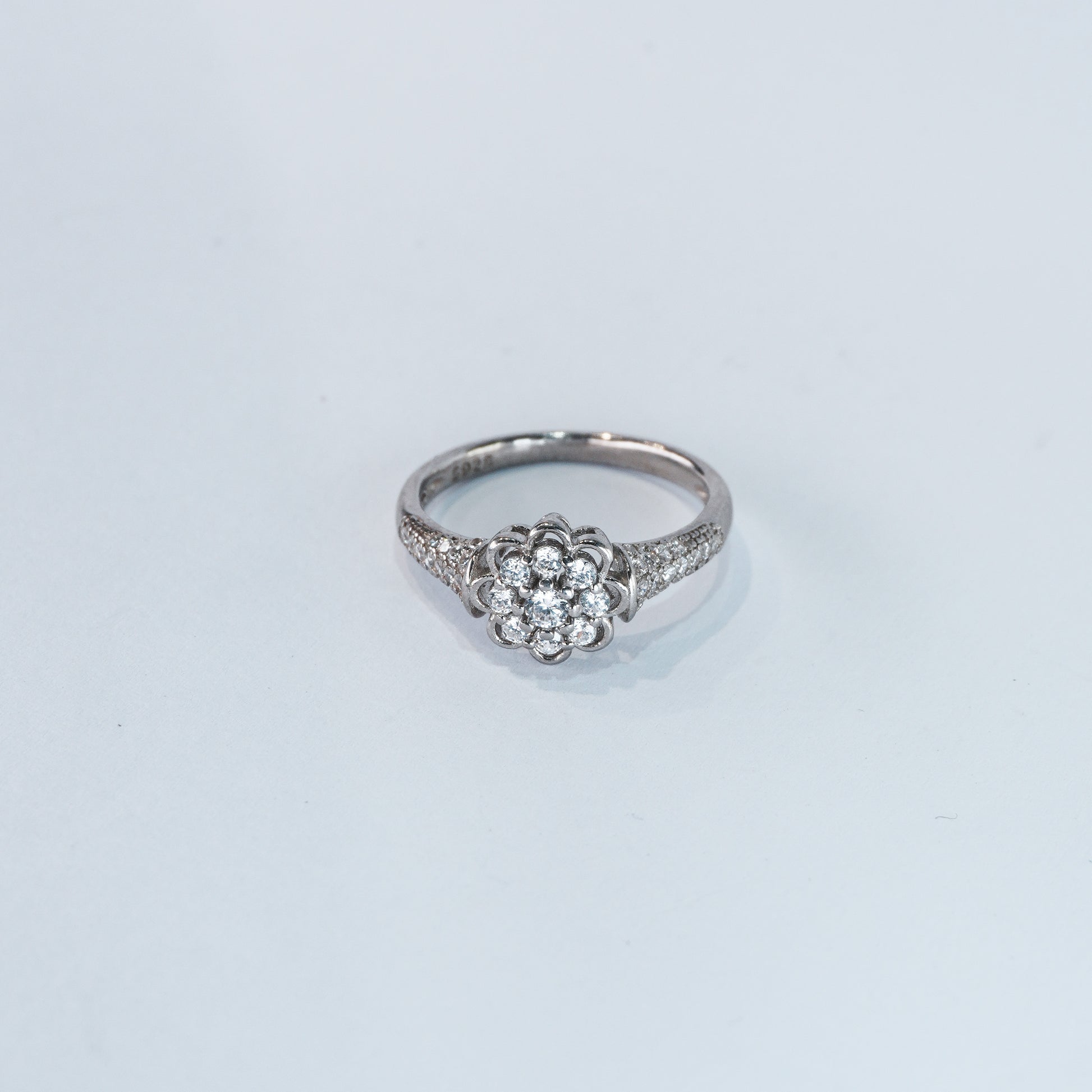 A graceful floral-inspired ring with a central cluster of diamonds and an antique-style silver setting. Perfect for timeless elegance and romantic gestures.